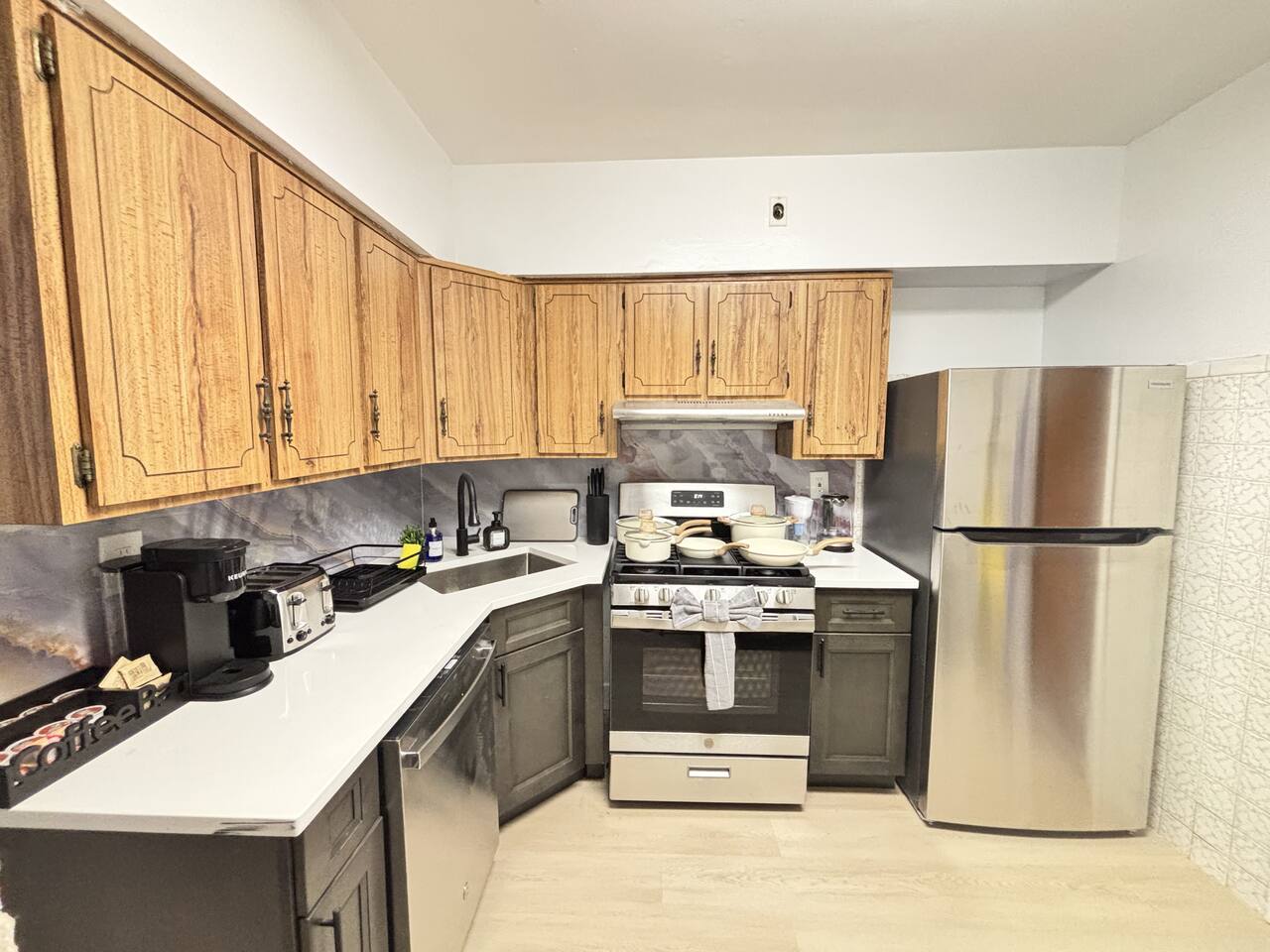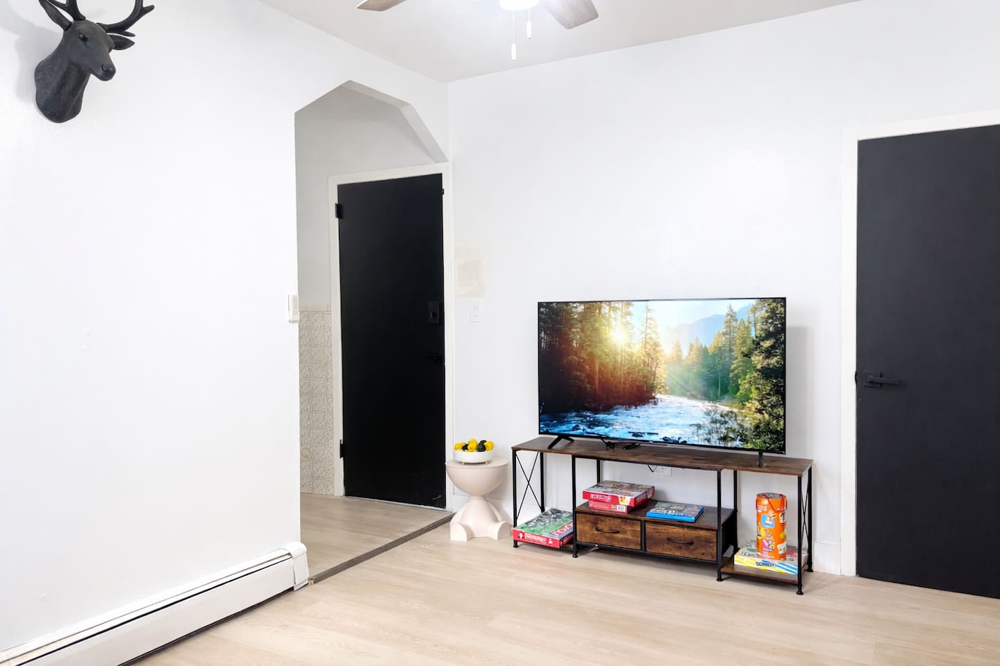 Welcome to this charming 3-bedroom, 1-bath home just 20 minutes from MetLife Stadium. The primary bedroom features a queen bed, workspace, TV, and warm vintage accents. Two additional bedrooms offer comfortable queen beds. Relax in the living room with a queen sofa bed, TV, and board games, or cook in the fully equipped kitchen with a cozy breakfast nook—perfect for both short visits and extended stays.