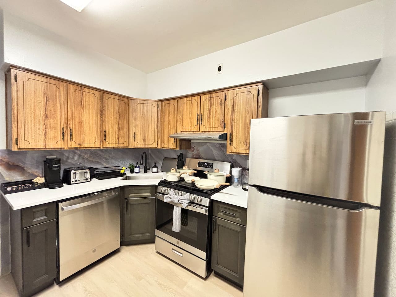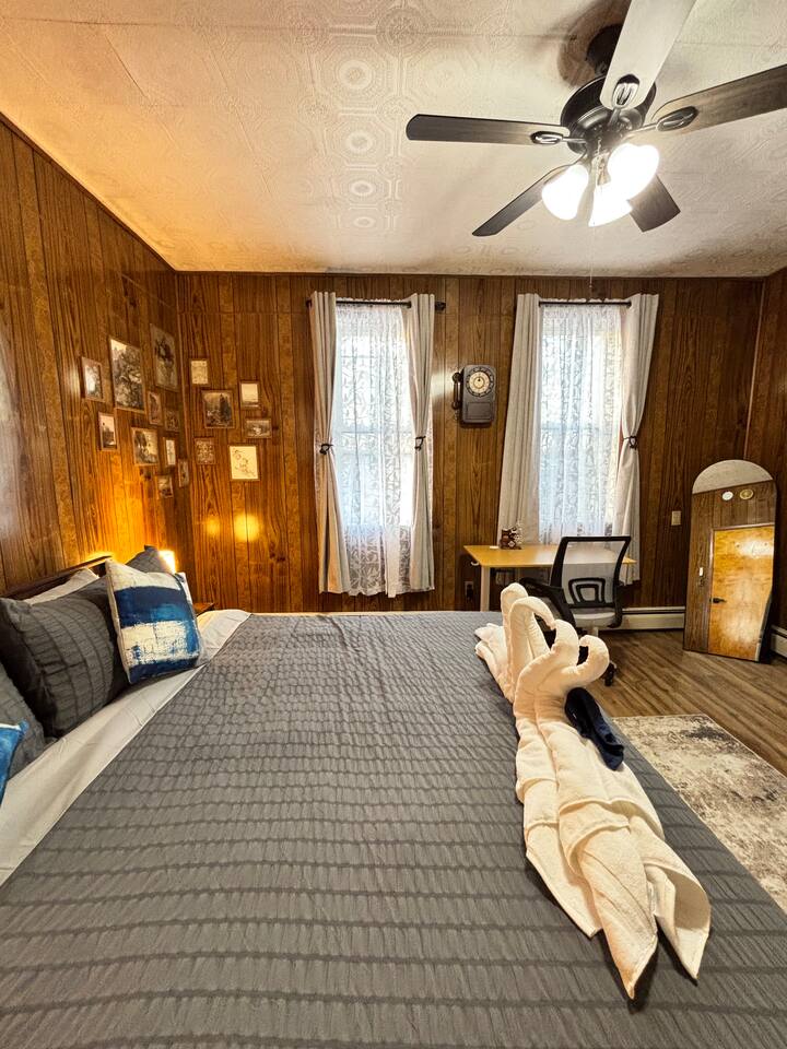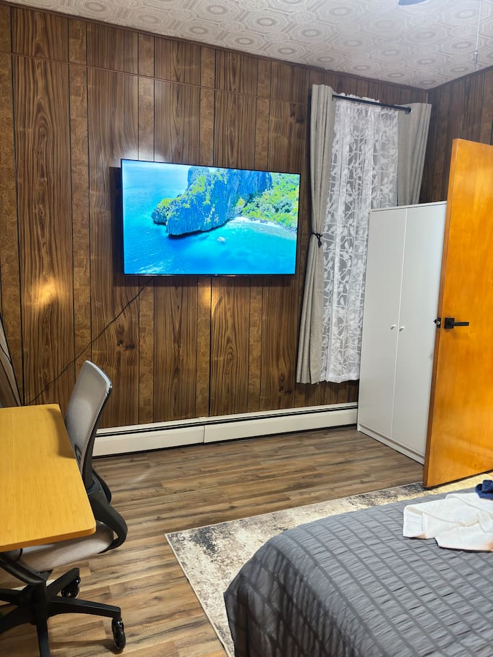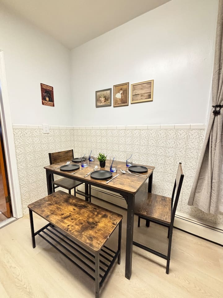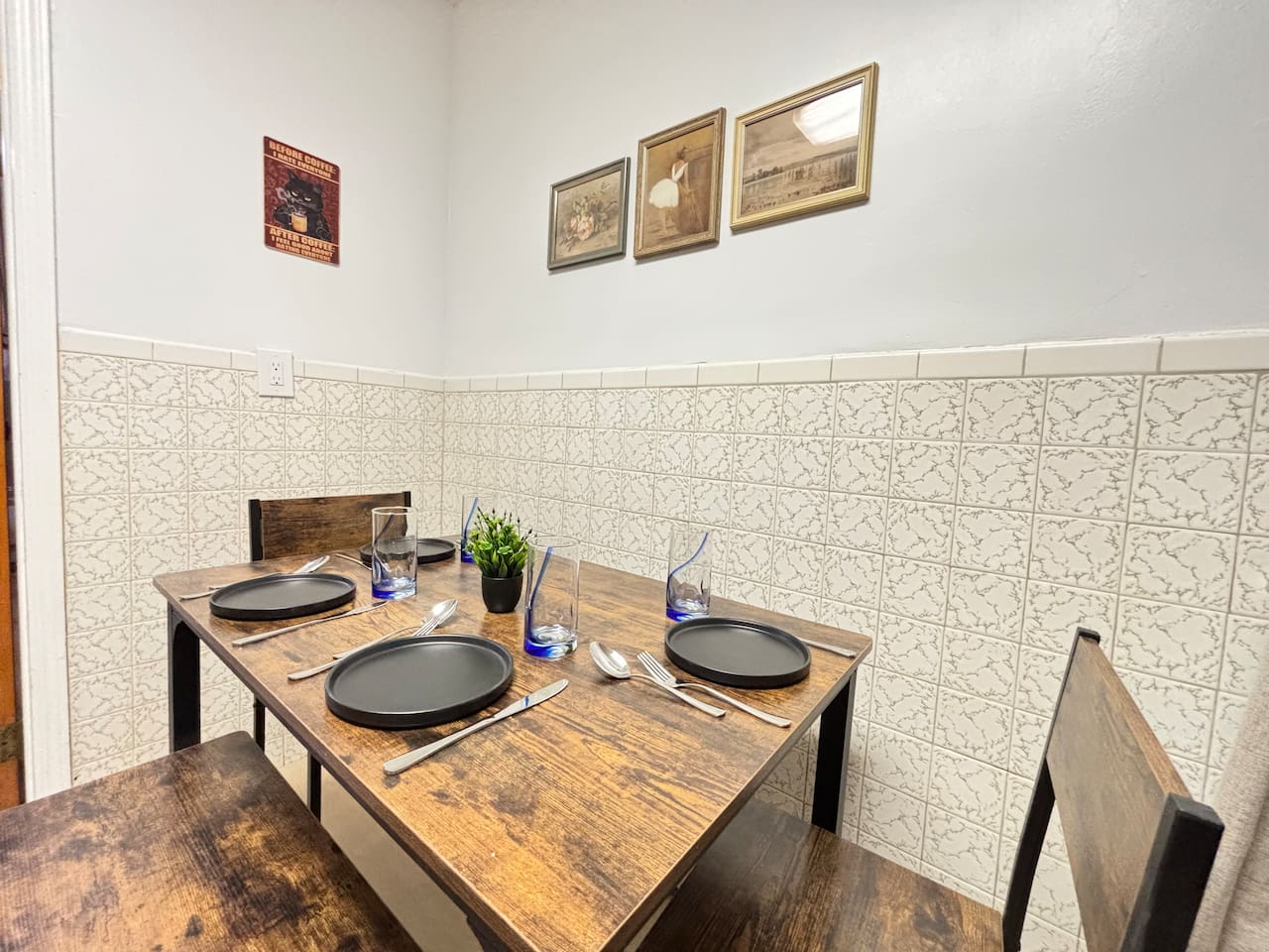 ✨ Amenities & Highlights 🛏 Comfortable Bedrooms: Thoughtfully designed 3-bedroom layout featuring a vintage-inspired master bedroom with a plush king bed, workspace, and TV. Bedroom 1 and Bedroom 2 each offer cozy queen beds to ensure restful nights for every guest. 🛋 Inviting Living Room: A warm and welcoming gathering space with a sofa bed, TV, and a variety of board games—perfect for relaxing evenings after exploring the area. 🍽 Fully Equipped Kitchen: Complete with essential cookware, appliances, and a dedicated dining area, making meal preparation and dining effortless and enjoyable. ⬆️ Stair Access: Please note that the home requires climbing stairs, providing elevated privacy and a quieter stay away from street-level noise. ✨ Thoughtful Design & Comfort: Blending charm, functionality, and carefully curated touches throughout, this home offers a memorable and comfortable stay for families, friends, and business travelers alike.