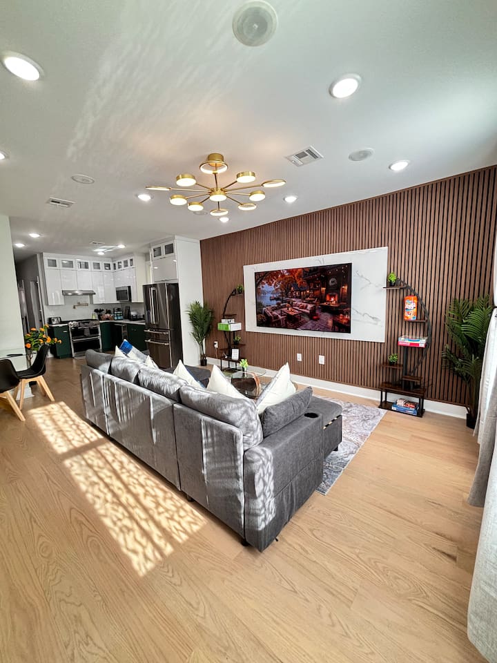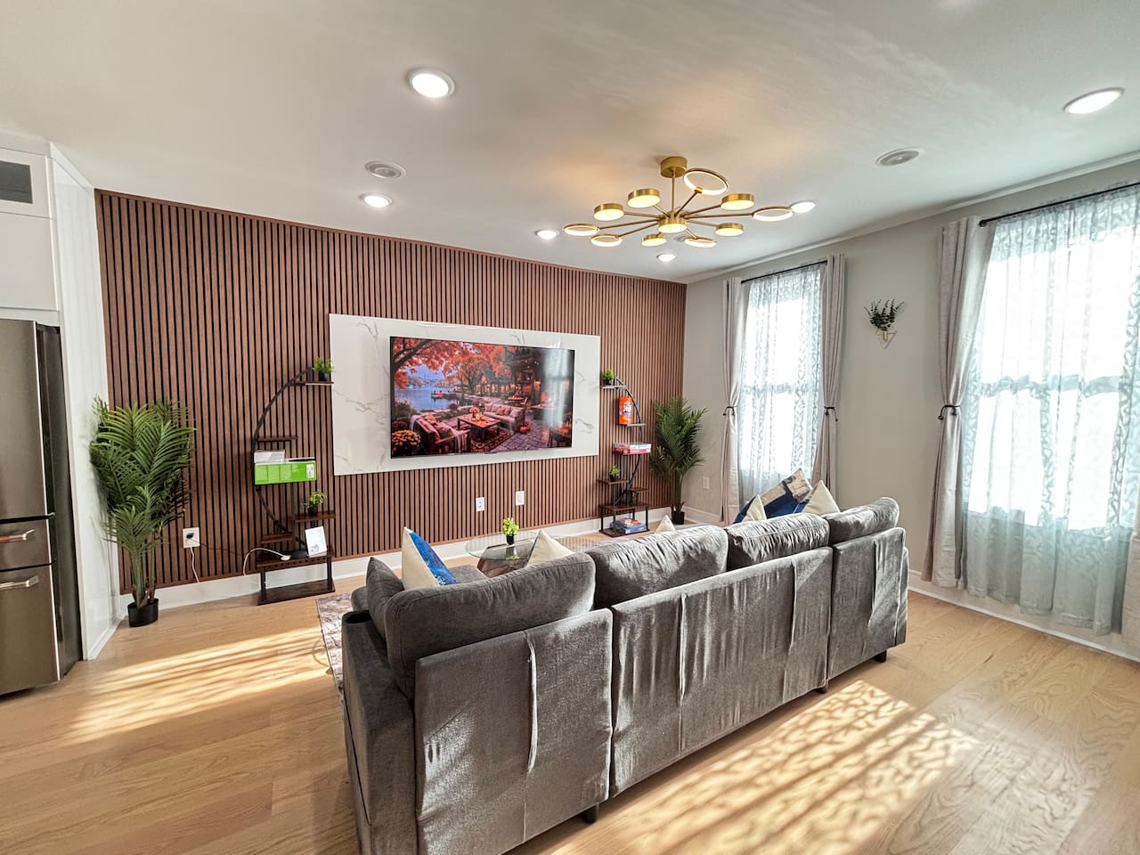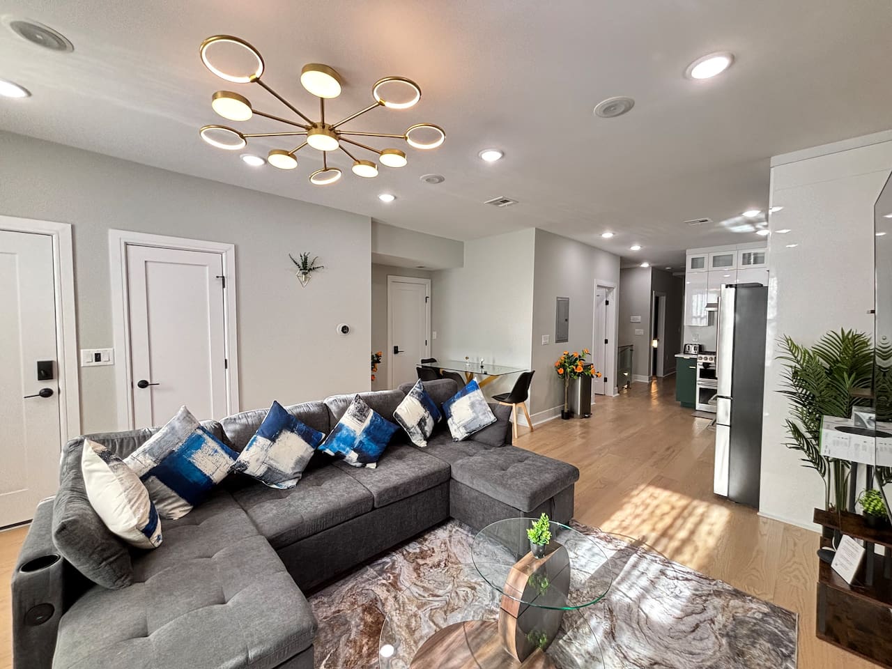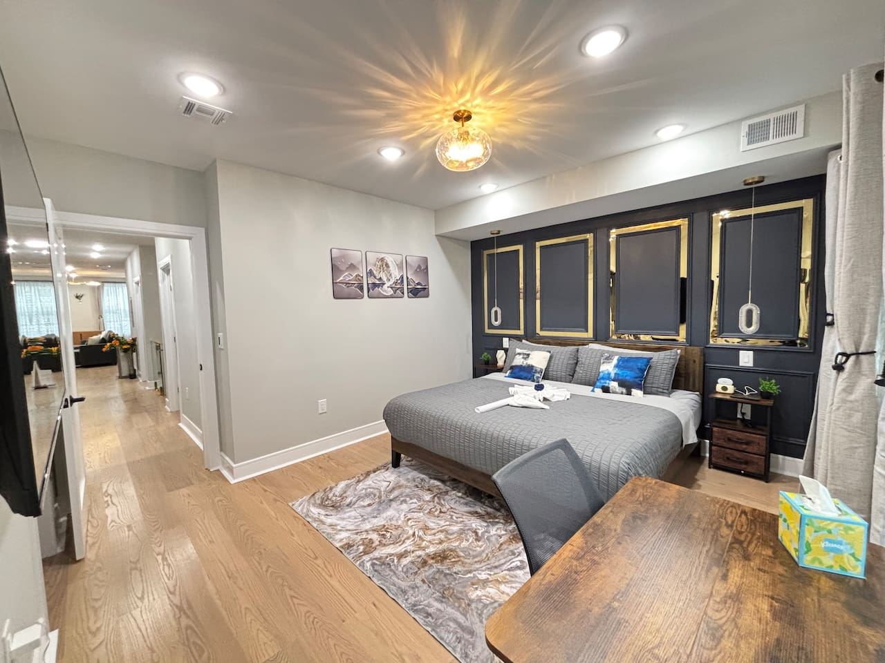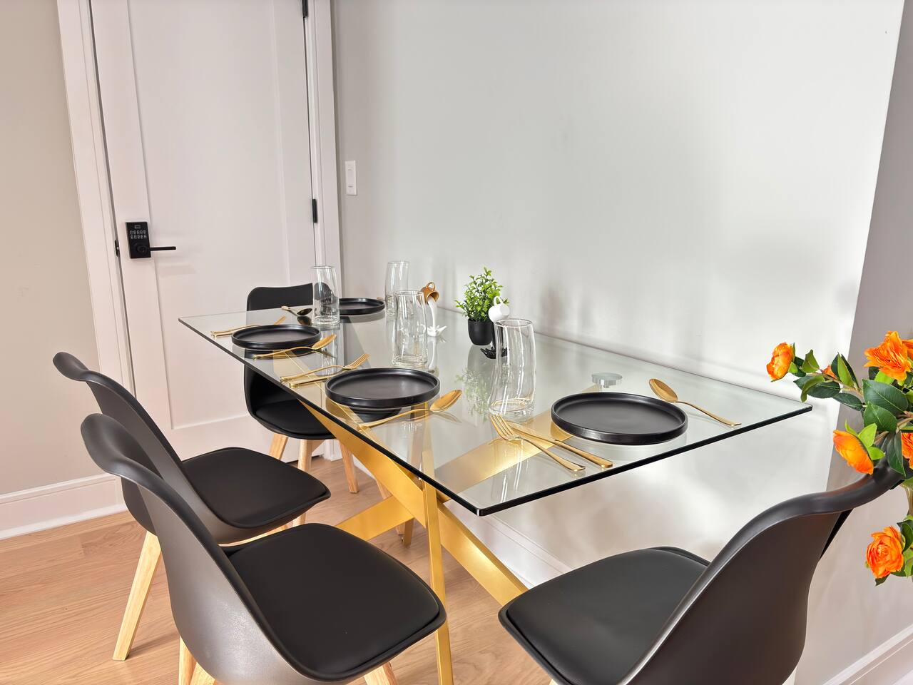 โจ Amenities & Highlights ๐ก Enhanced Safety: Ring cameras at the front entrance for added peace of mind. ๐จ High-Speed Internet: Lightning-fast 500+ Mbps Wi-Fi for streaming, work calls, and browsing. ๐ป Work-Friendly Space: Dedicated desk with built-in charging ports for productivity on the go. ๐ Luxurious Bedrooms: One king bed and two queen beds with 12-inch premium memory foam mattresses and fine linens. ๐ Stylish Living Room: Includes a queen pull-out sofa, Smart 4K Fire TV, and Xbox with Ultimate Game Pass (any purchases billed to your account). ๐ฒ Entertainment Ready: Selection of board games for cozy nights in. ๐ฝ Chef-Ready Kitchen: Fully stocked with a stove, dishwasher, refrigerator, microwave, toaster, coffee maker, and all cookware essentials. โ๏ธ Smart Refrigerator: ThinQ fridge with filtered water, crushed/cubed ice, and Wi-Fi controls. ๐งด Hotel-Quality Essentials: Fresh linens, plush towels, and premium toiletries for a refined stay. ๐งบ Laundry Access: Samsung Bespoke washer and dryer located downstairs, accessible via a short flight of stairs. โจ Spotless Clean: Professionally cleaned and sanitized before and after each stay for a pristine environment.