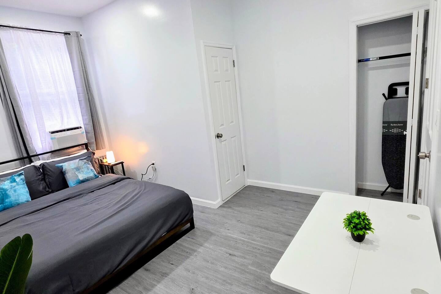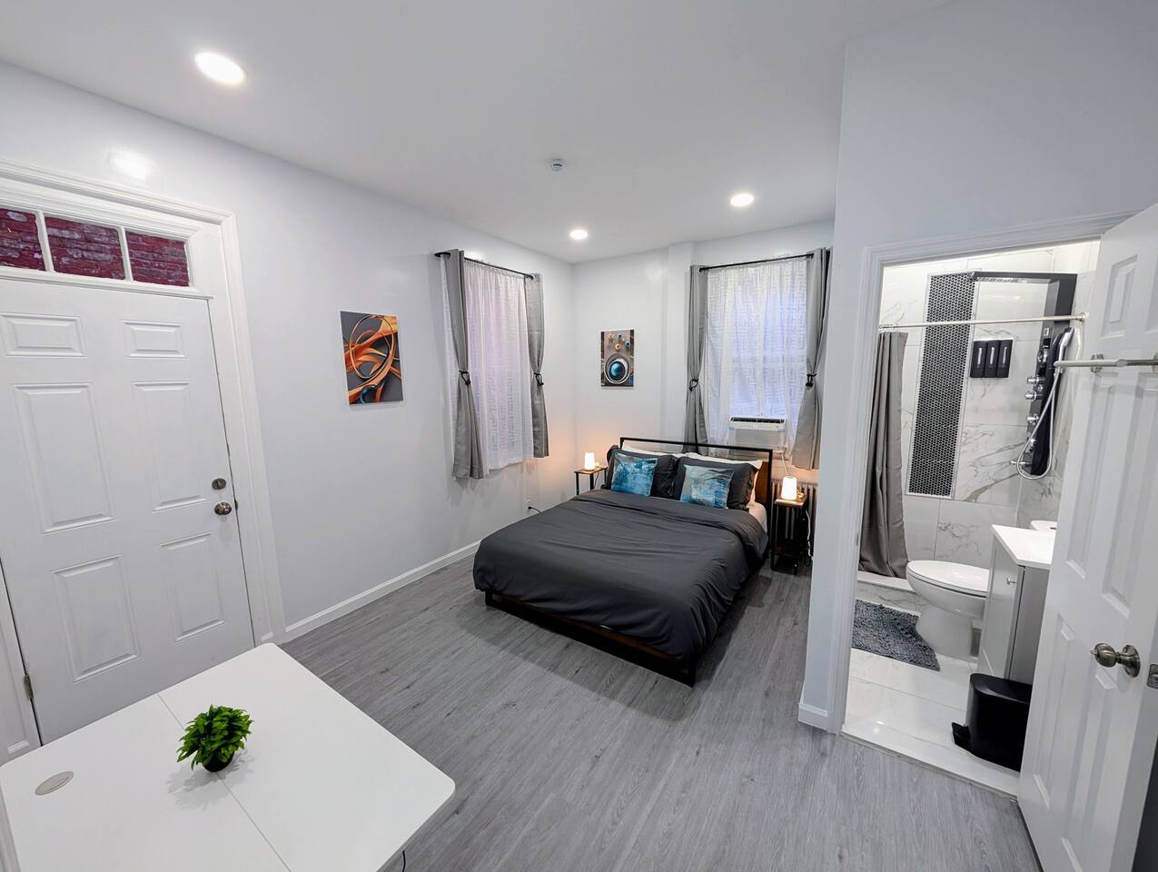 Internet Access & Workstations High-speed Wi-Fi (500Mbps+). Network details available on-site. Equipped with adjustable desks & ergonomic chairs. Heating and Cooling Smart climate control with thermostat heating ensures year-round comfort, complemented by smart air-conditioning units in the bedrooms and living room. Compact Culinary Haven Fully equipped kitchen & coffee station with modern appliances. Cookware, dishes, and utensils provided. Guests kindly tidy after use. Laundry Facilities Washer and dryer in-unit for convenient use. House Rules 🚭 No smoking inside 🐾 No pets (unless pre-approved) 🔕 Quiet hours: 10 PM – 8 AM 🎉 No parties/events without prior approval 👥 Guest count must match reservation Parking: Please note: this listing does not include a driveway or garage—**only street parking is available. As this is an urban area, finding a spot can be more challenging in the evenings, so plan accordingly. Be sure to follow all street cleaning regulations. 🚫 Important: The driveway shown in photos does not belong to this unit. Kindly avoid parking there to prevent issues. Book your stay today and experience modern luxury and convenience in Jersey City!